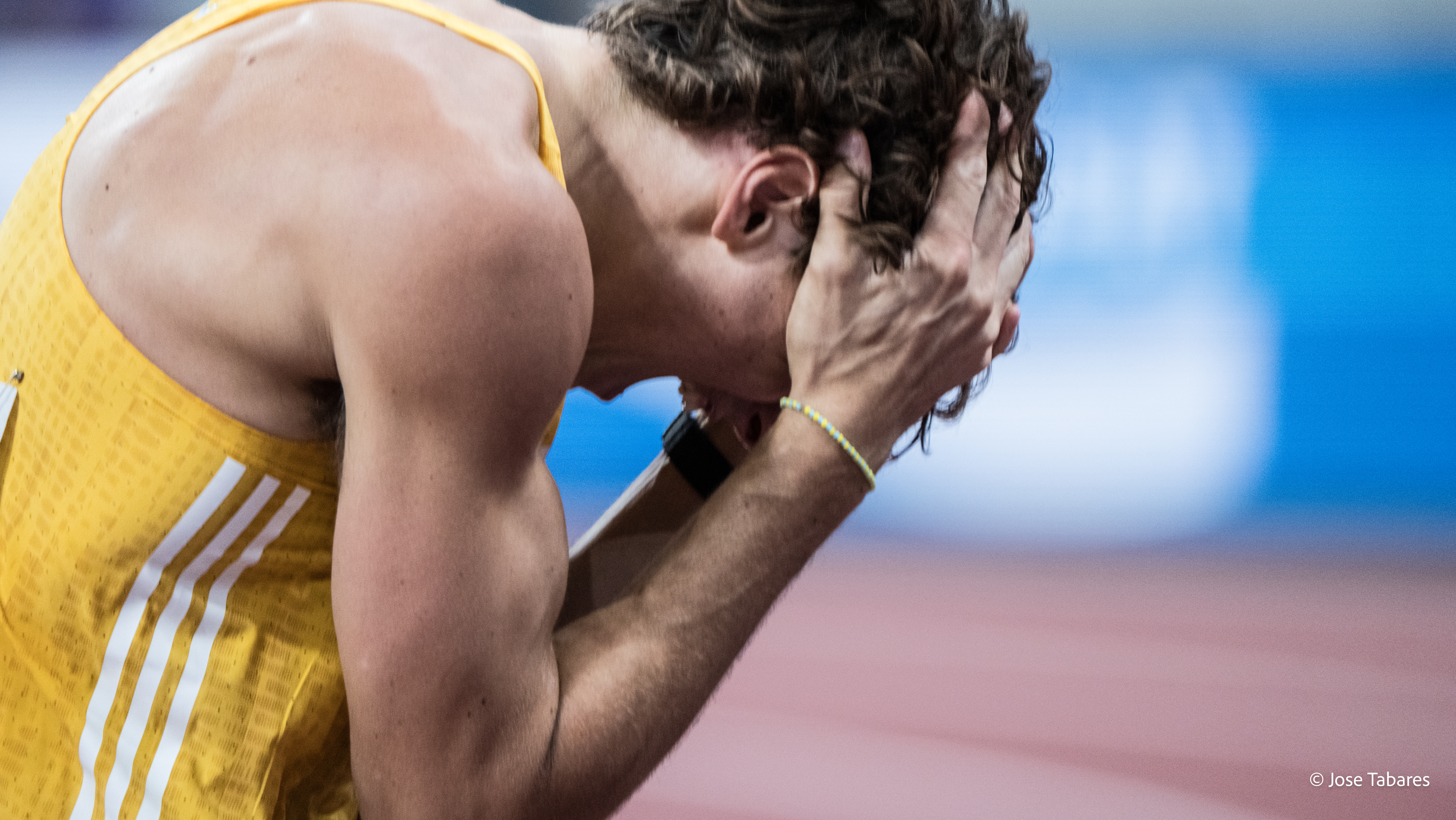 Portrait of American 5 times Wrestling Champion World : Jordan Ernest BURROUGHS. He runs smiling on the mattress after defeating his opponent and achieving the 5th gold medal in the World Wrestling Championships